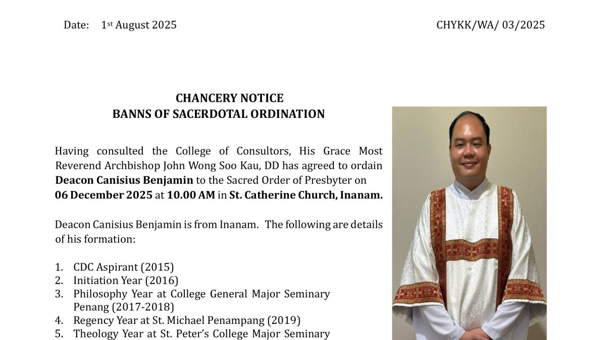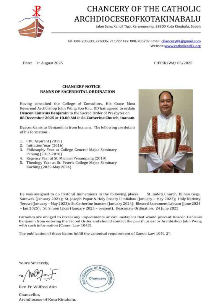 CHANCERY NOTICE: BANNS OF SACERDOTAL ORDINATION – DEACON CANISIUS BENJAMIN